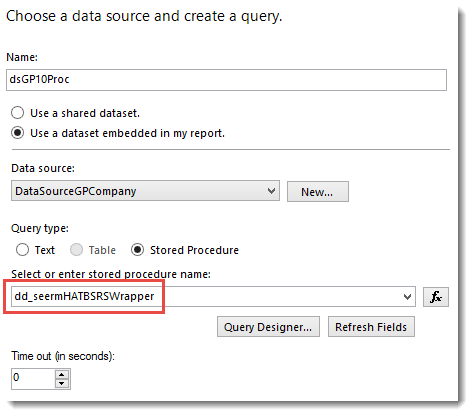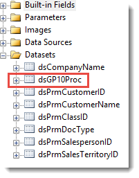 2. Open the report. I used SQL Server Report Builder. Find the main dataset of the report. I am modifying the Historical Aged Trial Balance report so the main dataset is "dsGP10Proc". Right click on that dataset and open Dataset Properties. The stored procedure for this dataset is "seermHATBSRSWrapper".
